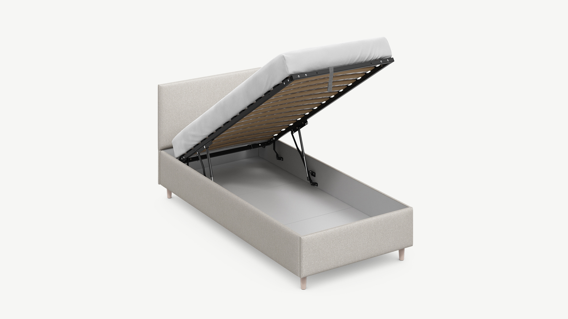• Скрытая под основанием вместительная емкость без внутренних перегородок позволяет использовать всю площадь подкроватного пространства для хранения вещей.