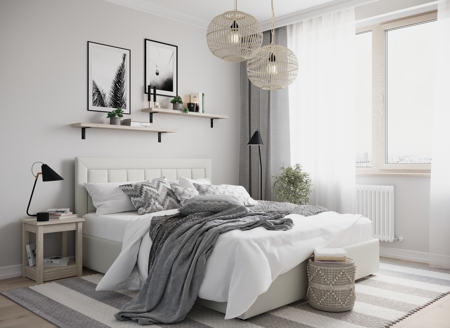 Создать гармоничный интерьер, а также целостный образ спальни помогут дополнительные аксессуары - например, тумбы, банкетки, подушки.