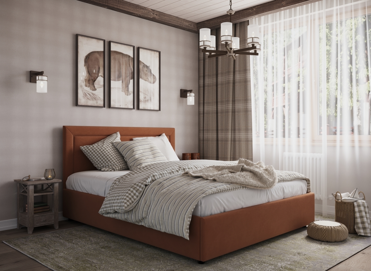 Создать гармоничный интерьер и завершить образ спальни помогут дополнительные аксессуары, например: тумбы, банкетки, подушки.