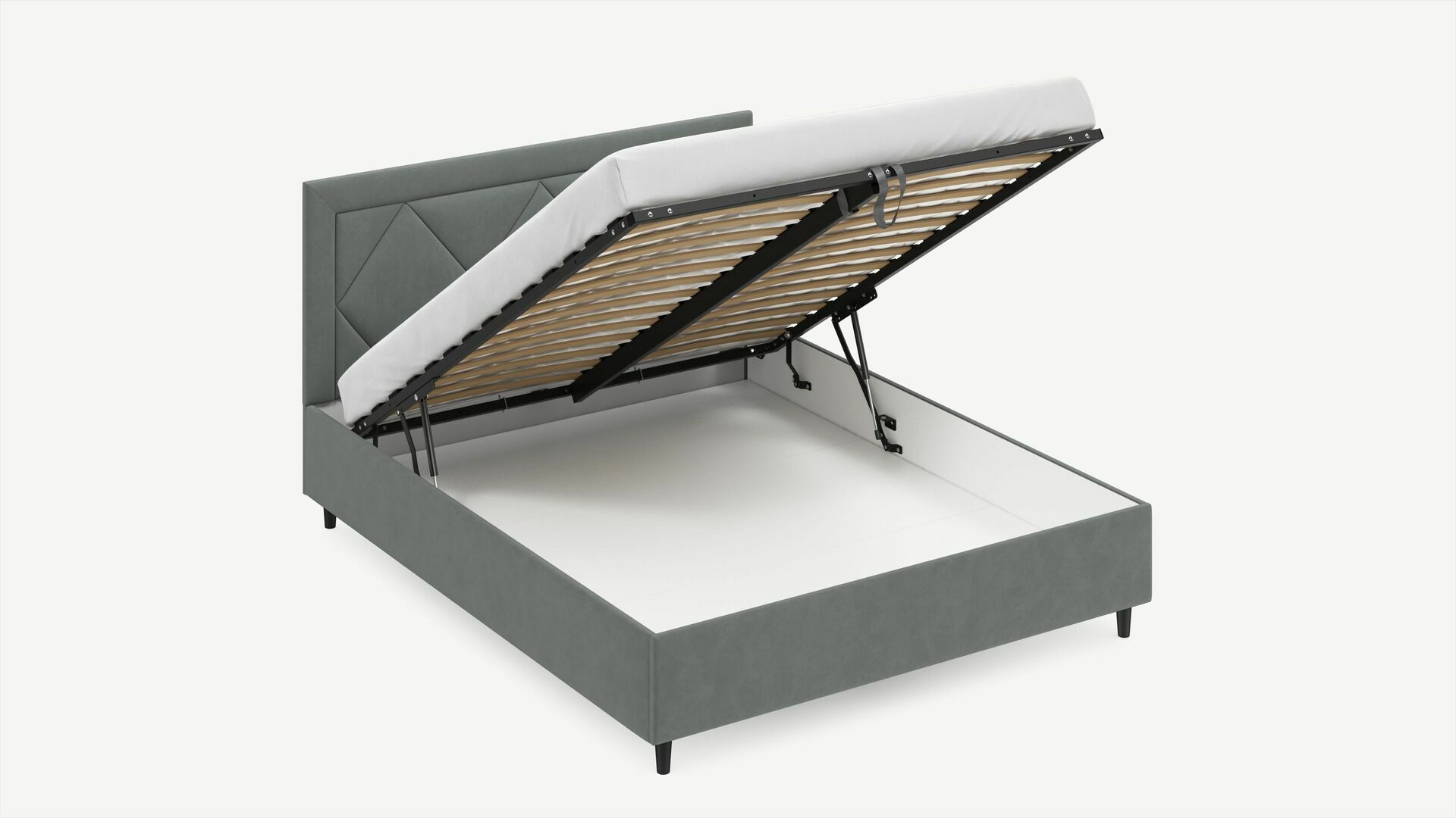 • Скрытая под основанием вместительная емкость без внутренних перегородок позволяет использовать всю площадь подкроватного пространства для хранения вещей.