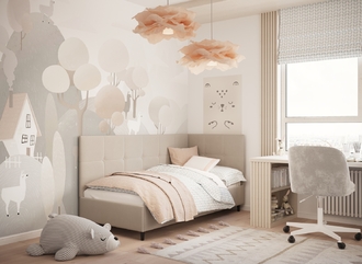 Угловая односпальная кровать MOON FAMILY 1261 с мягкой спинкой и изголовьем создаст в Вашей спальне ощущение уюта. Крупная квадратная стежка привносит в интерьер графических акцентов, а вставка из пуговиц наполняет пространство ощущением домашнего тепла.