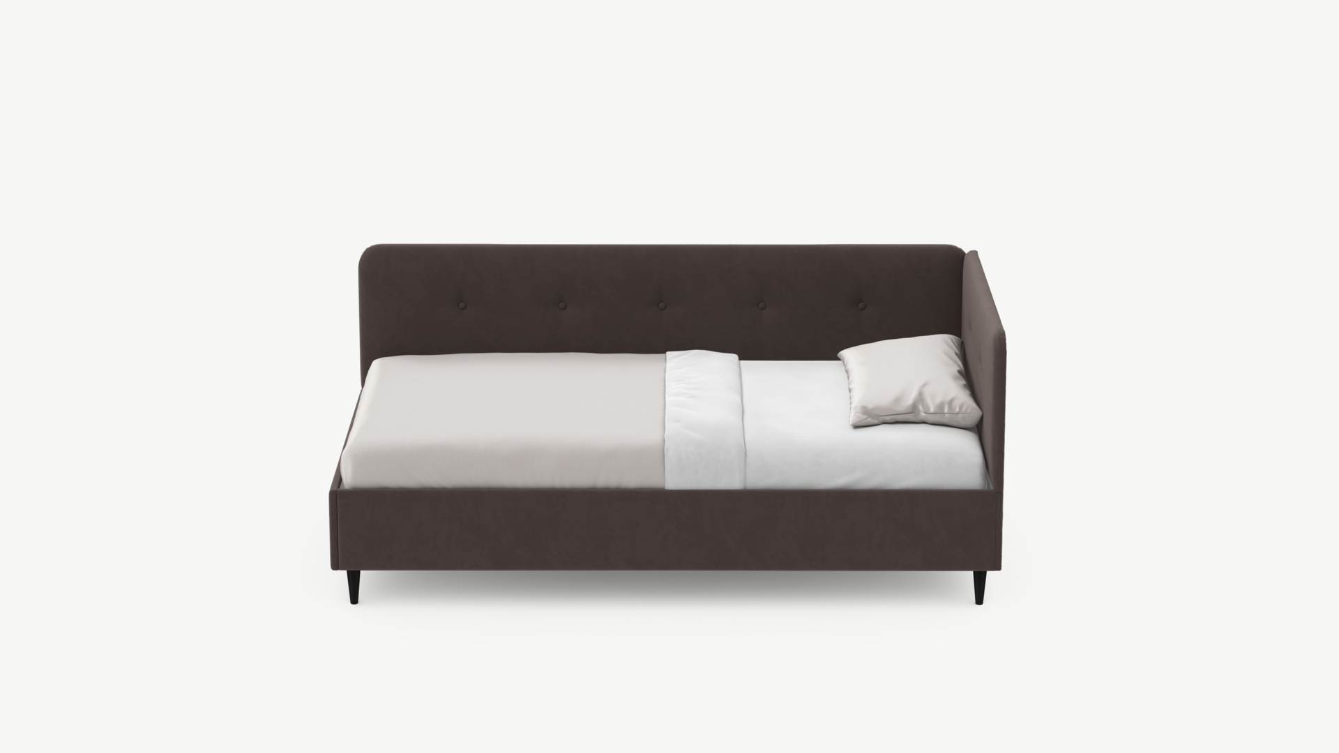Угловая односпальная кровать MOON FAMILY 1253 с мягкой спинкой и изголовьем обладает округлыми формами, привносящими в интерьер нотки нежности. Изголовье, украшенное пуговицами, добавляет окружающему пространству шарм и уют. Высокие опоры придают кровати визуальной легкости, а также обеспечивают удобство во время уборки.