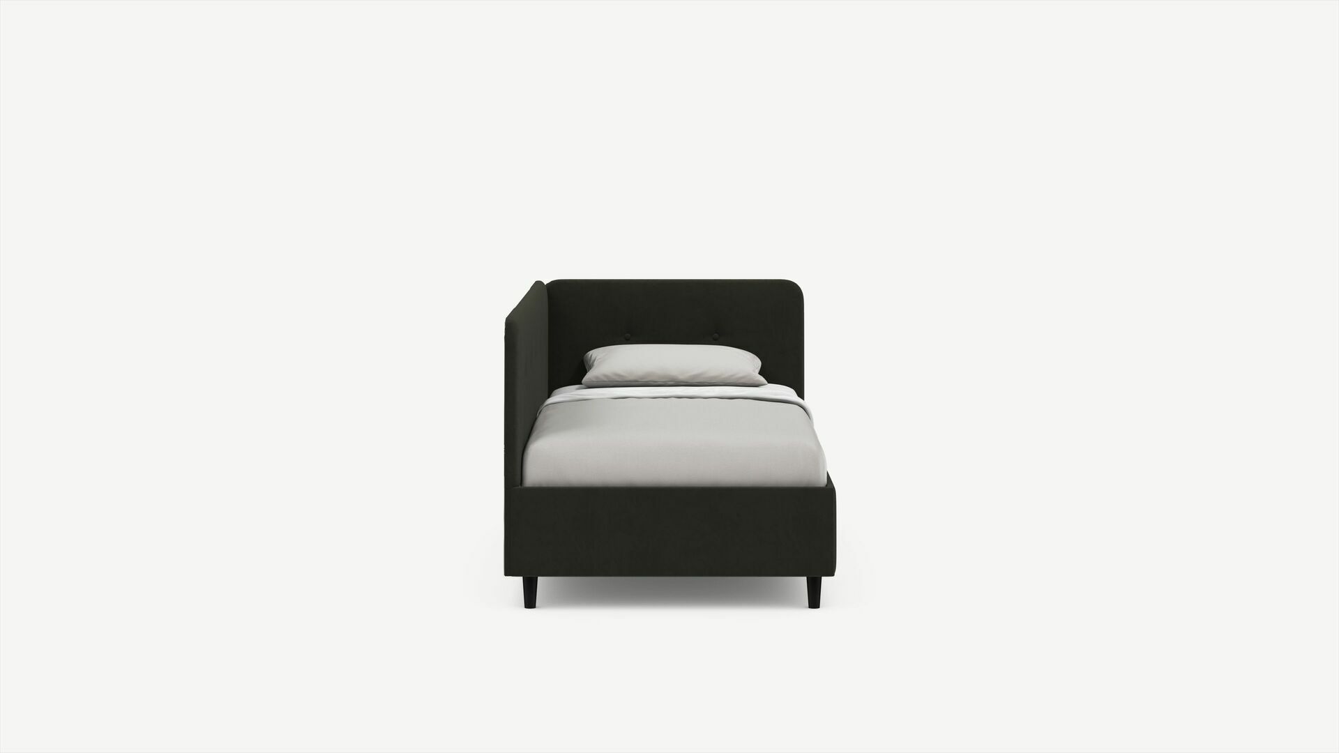 Угловая односпальная кровать MOON FAMILY 1253 с мягкой спинкой и изголовьем обладает округлыми формами, привносящими в интерьер нотки нежности. Изголовье, украшенное пуговицами, добавляет окружающему пространству шарм и уют. Высокие опоры придают кровати визуальной легкости, а также обеспечивают удобство во время уборки.